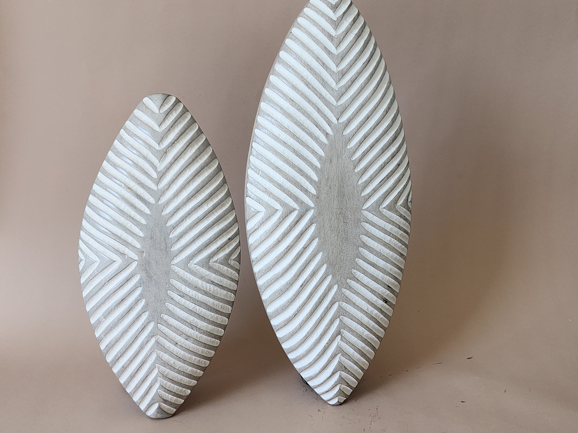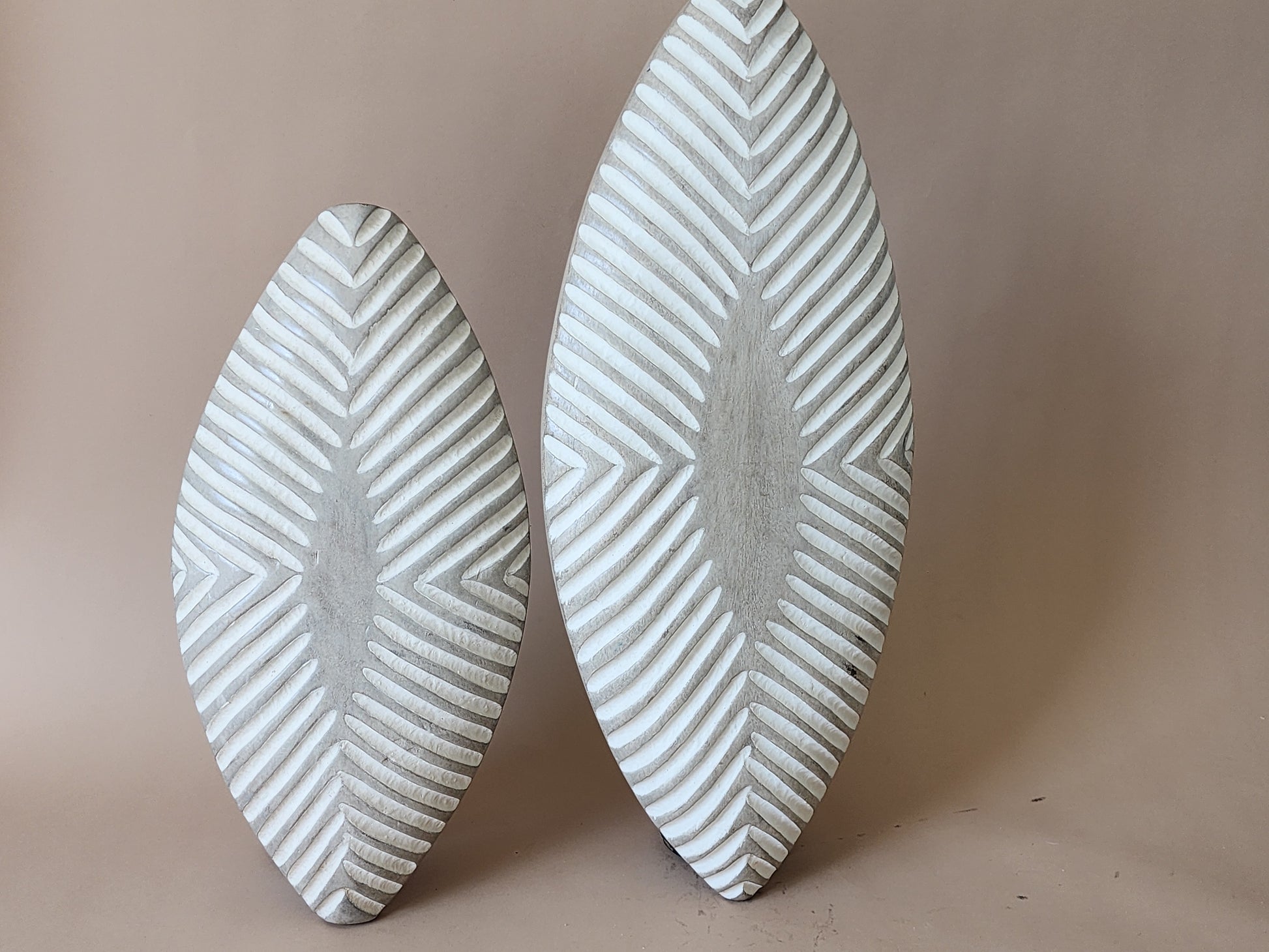 The front of each shield has a grooved, geometric pattern representative of the tribe of the artisan. A handle is carved on the back. The shields are made from solid wood native to the area.
