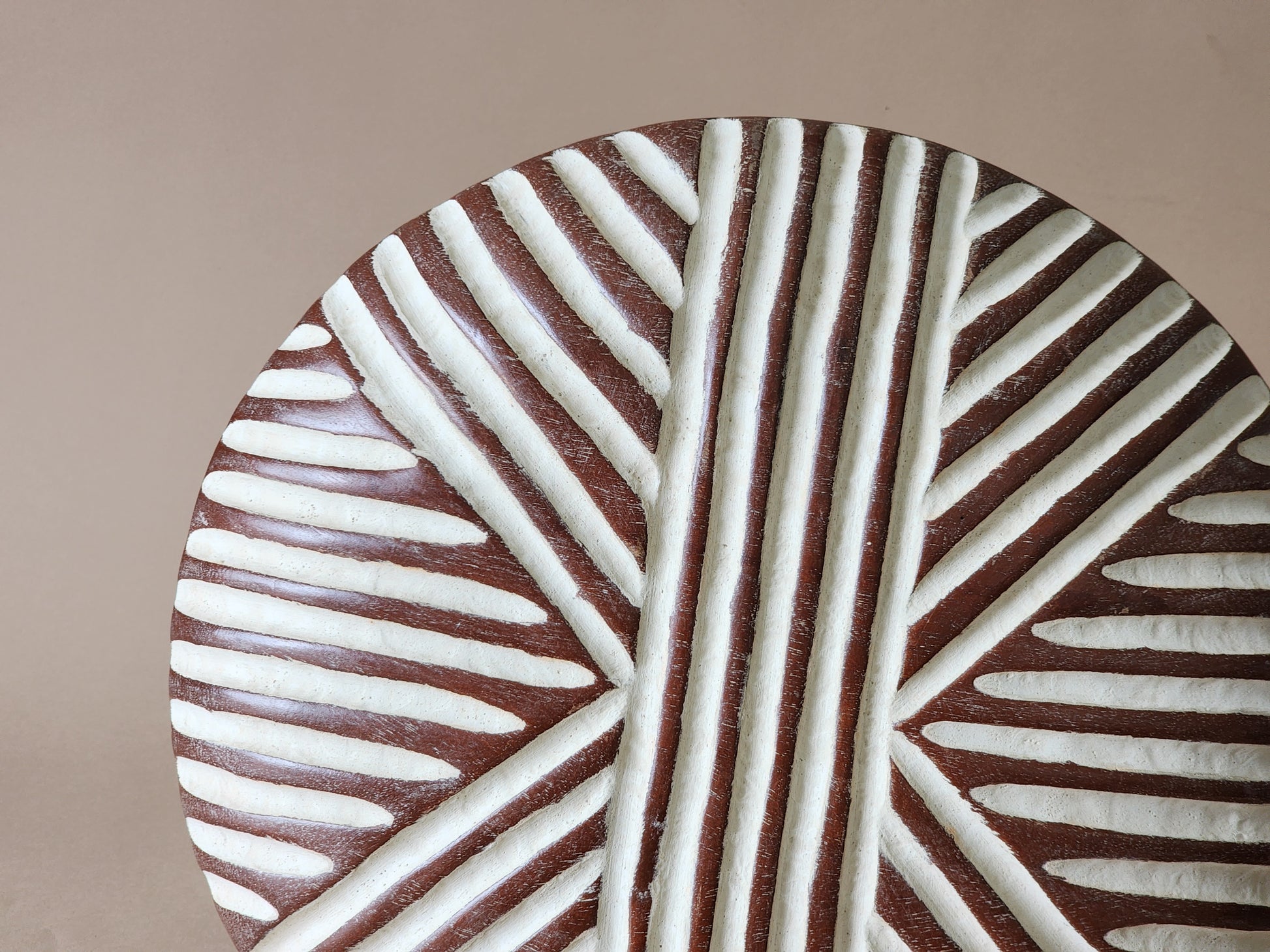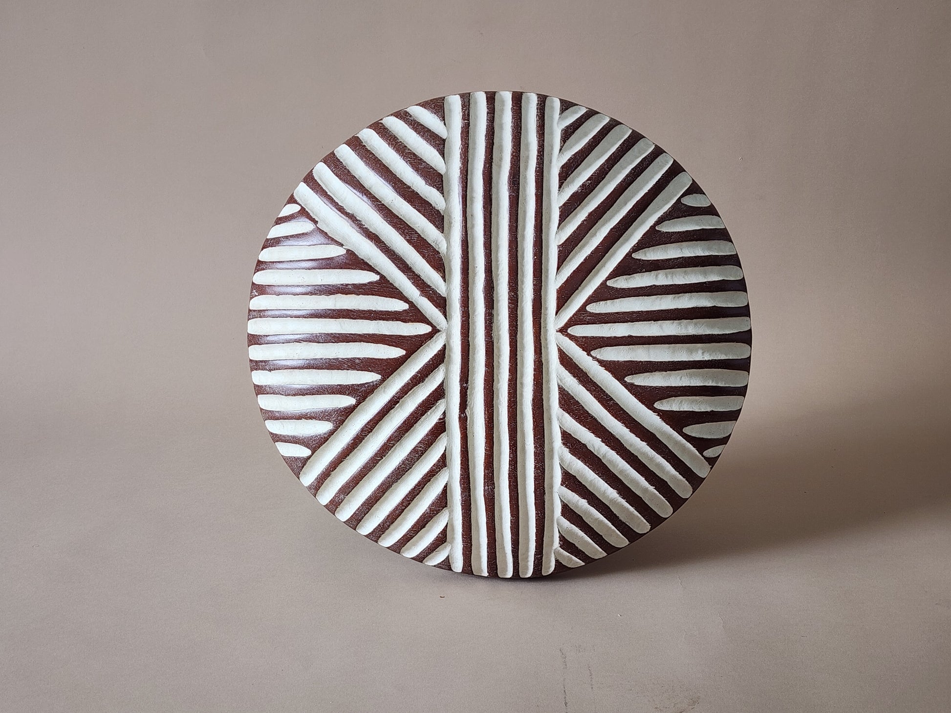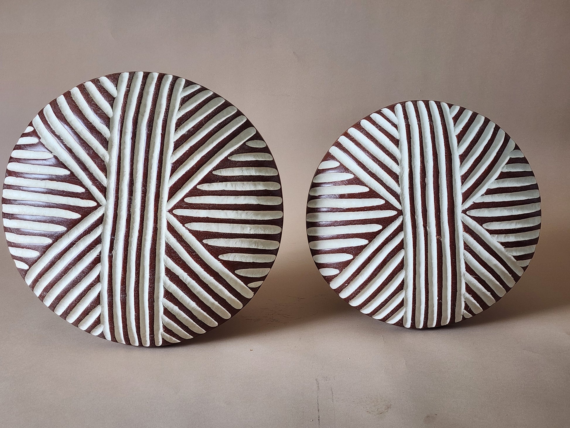 Hand carved from a solid piece of teak wood, their surface features geometric patterns covered with white clay