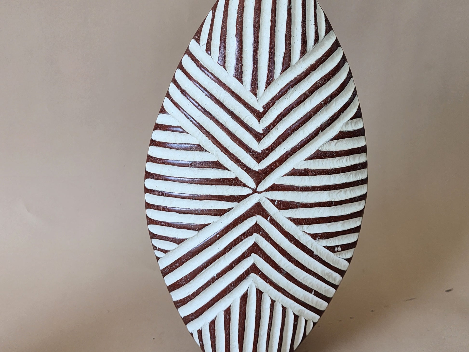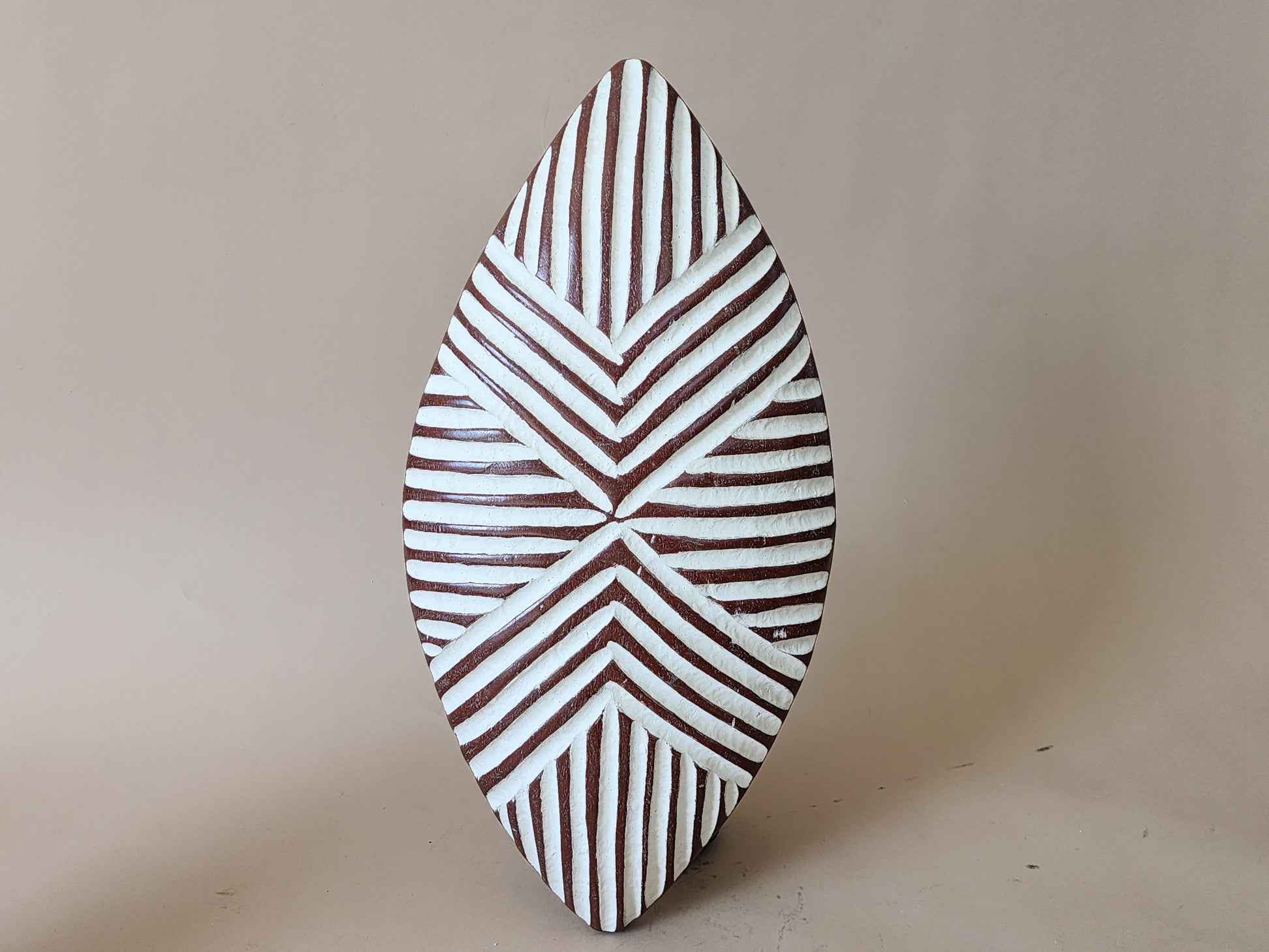 The front of each shield has a grooved, geometric pattern representative of the tribe of the artisan. A handle is carved on the back. The shields are made from solid wood native to the area.
