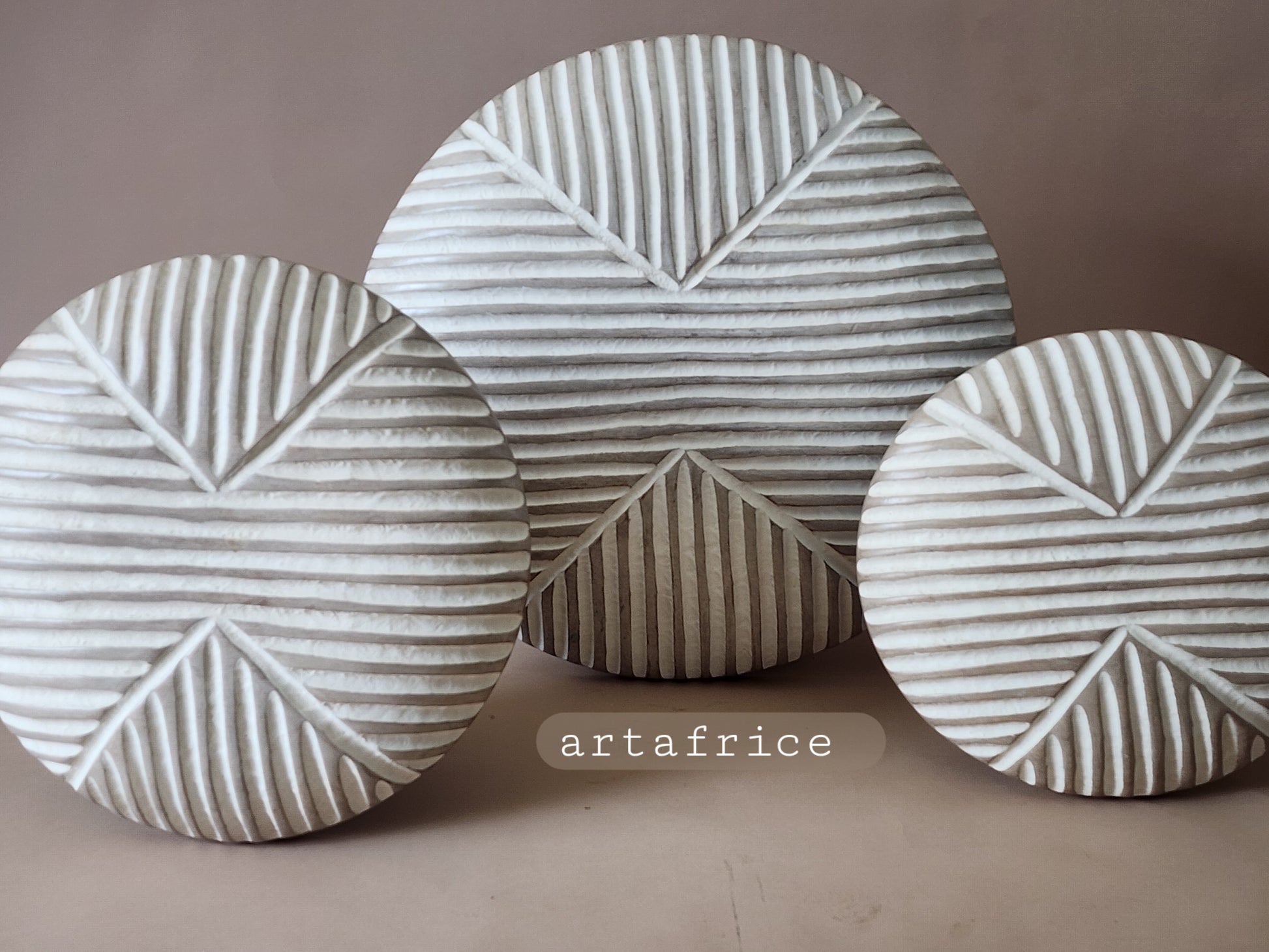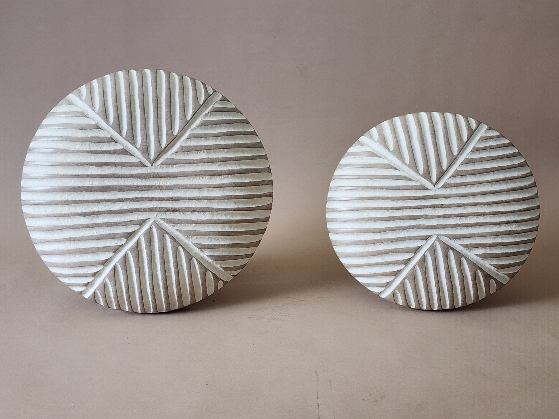 The front of each shield has a grooved, geometric pattern representative of the tribe of the artisan. A handle is carved on the back. The shields are made from solid wood native to the area.