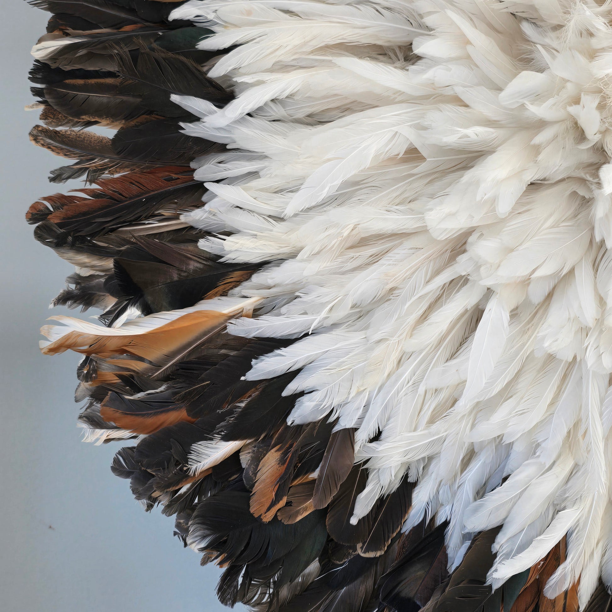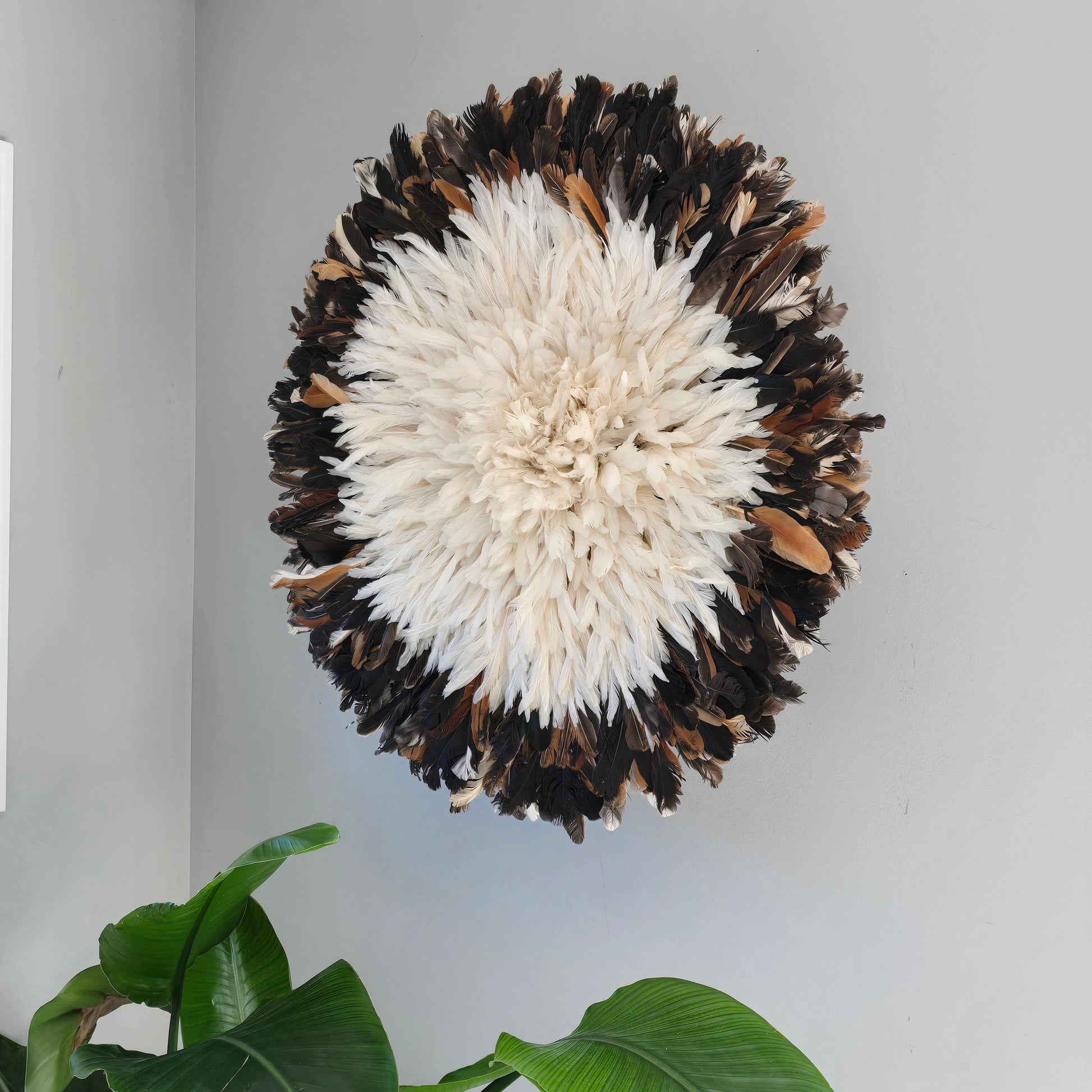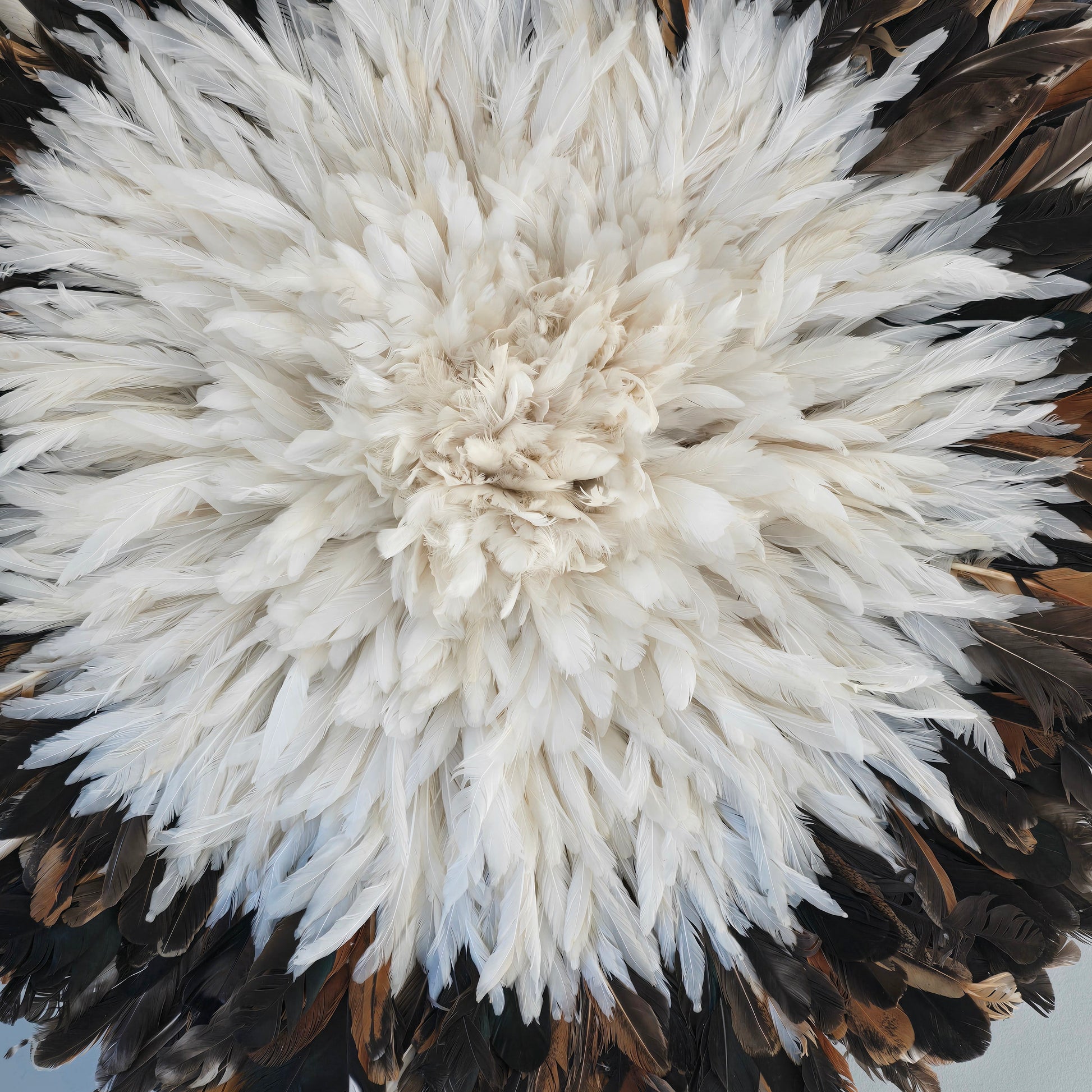 we proudly create authentic, handcrafted Juju hats inspired by the traditional feather headdresses of the Bamileke tribe in Cameroon. This Juju Hat is a stunning piece of wall decor that brings light, softness, and sophistication to any interior.