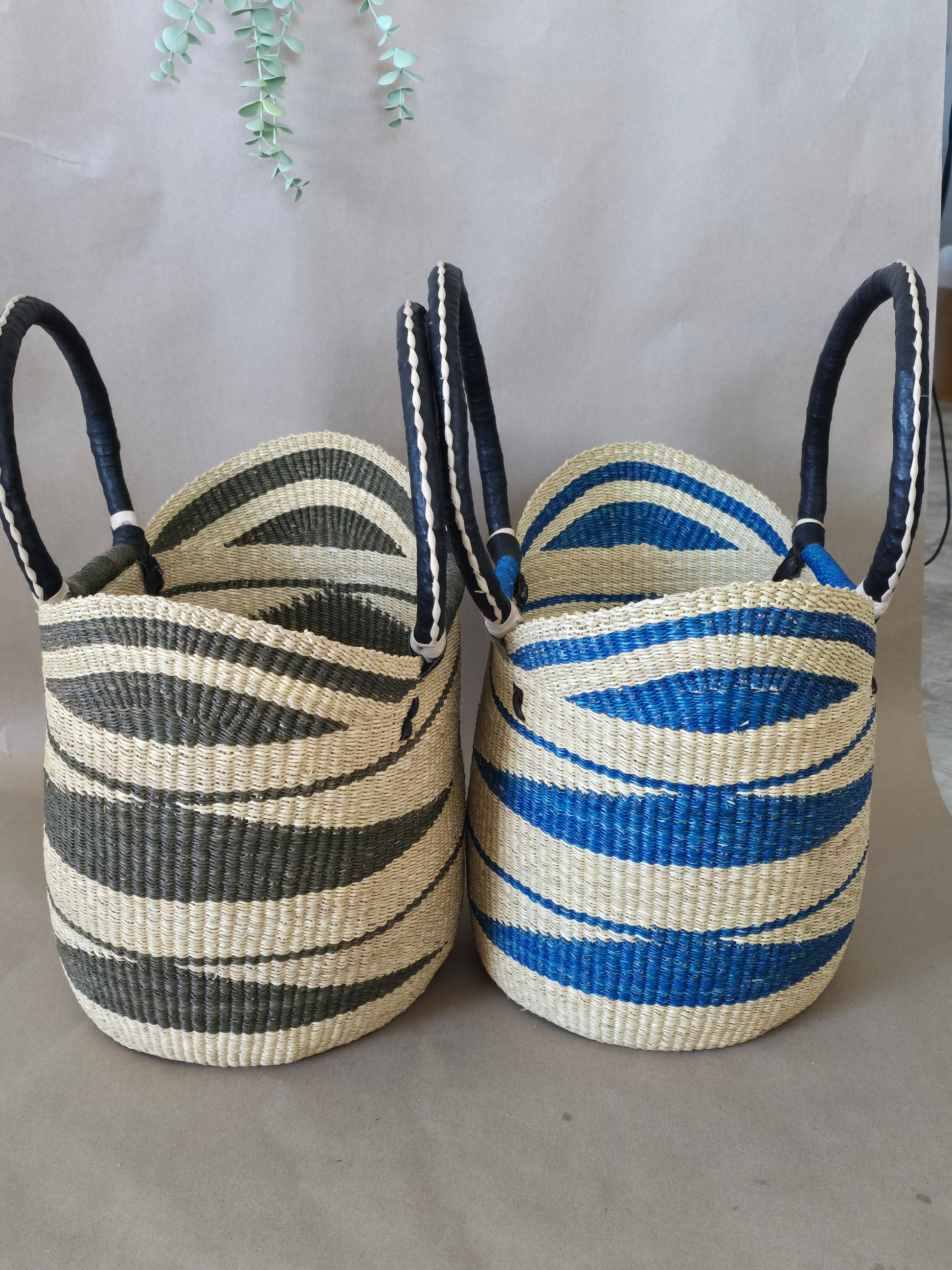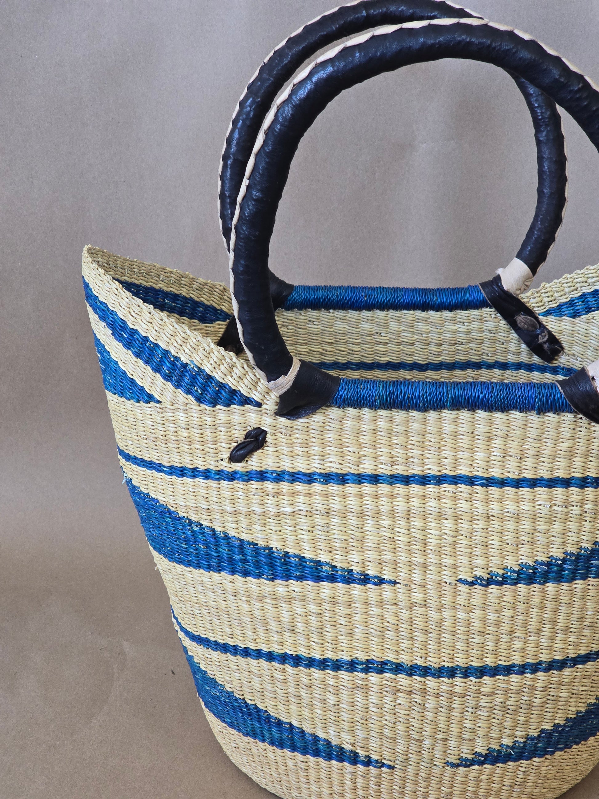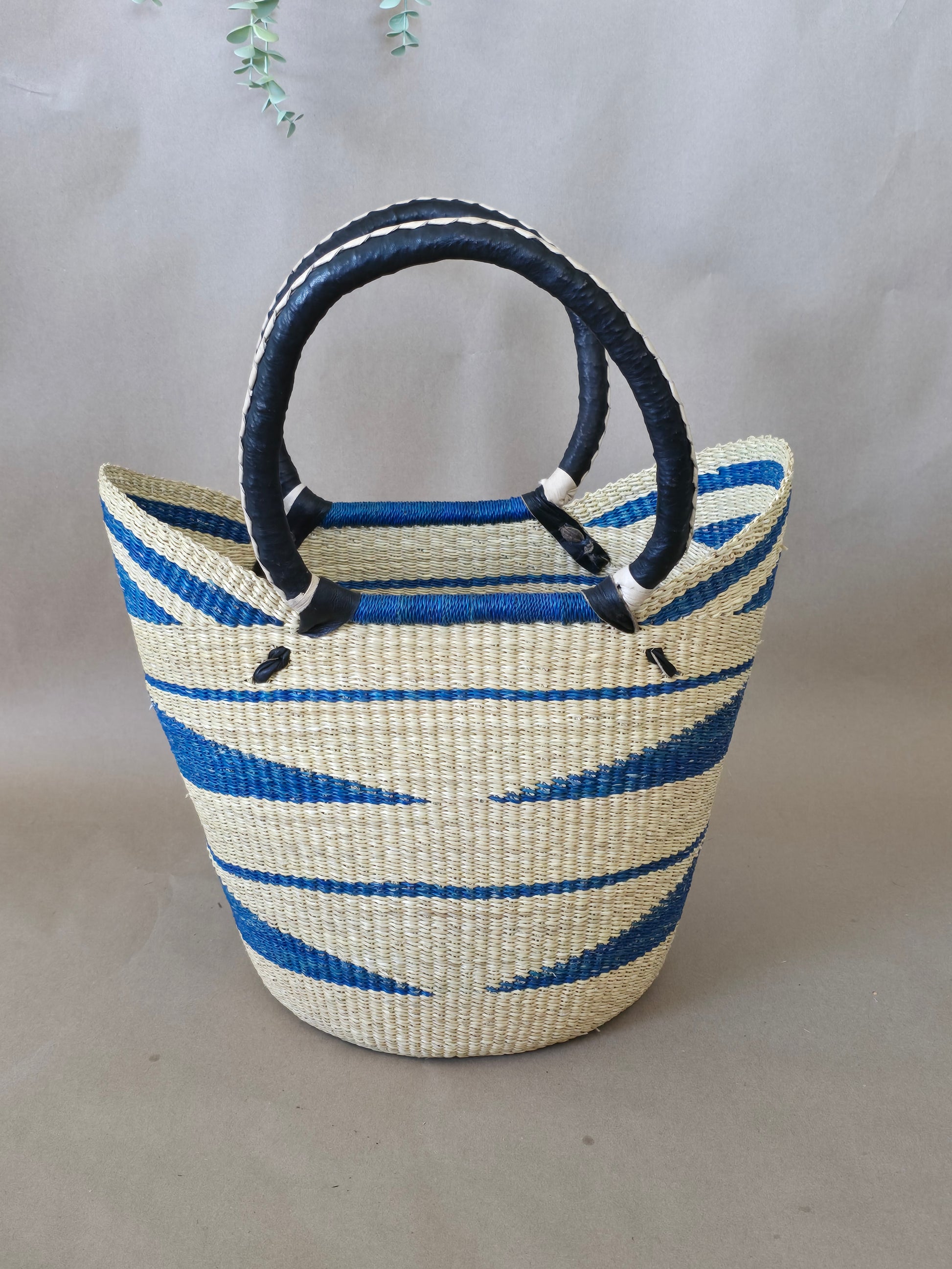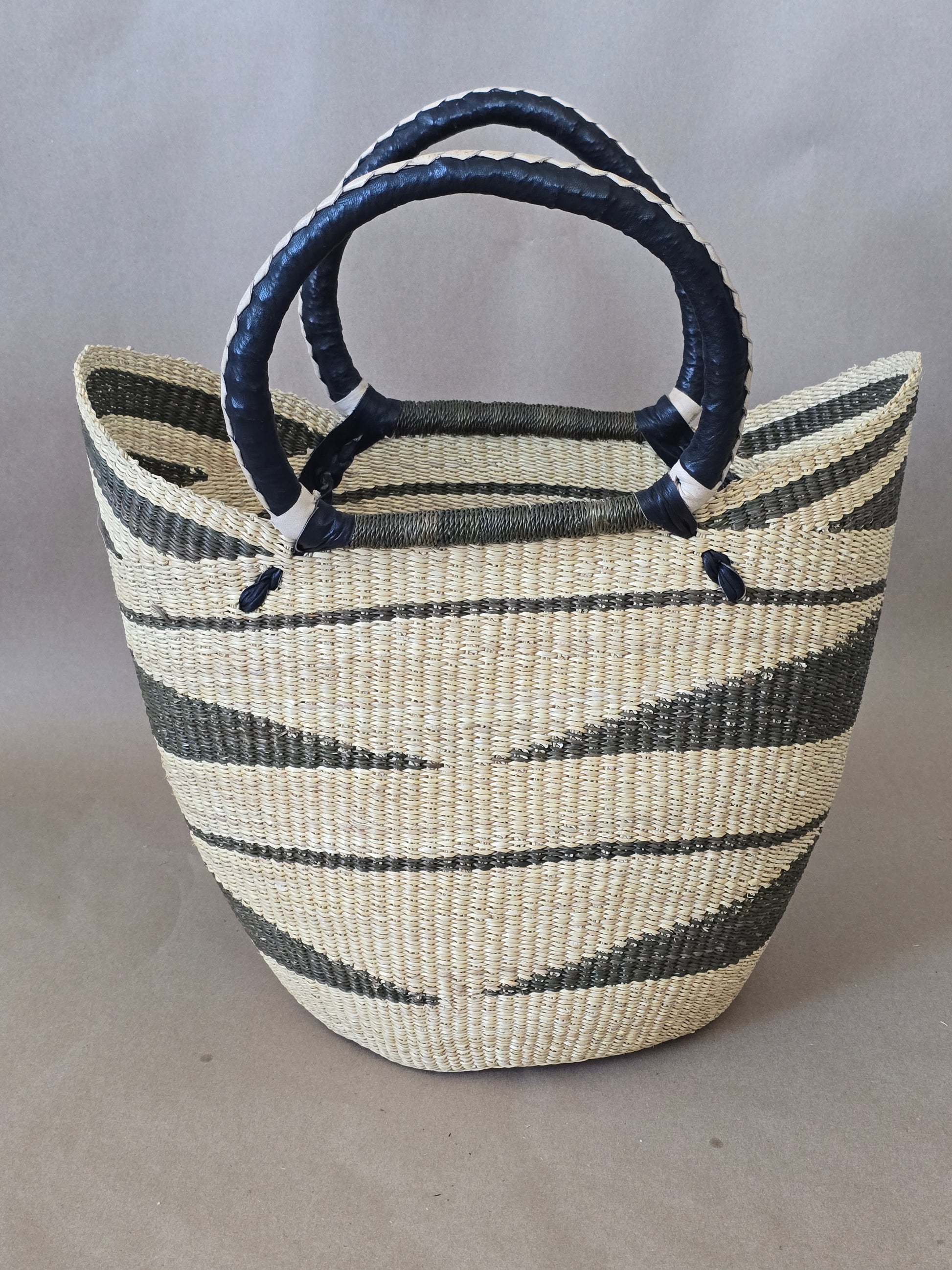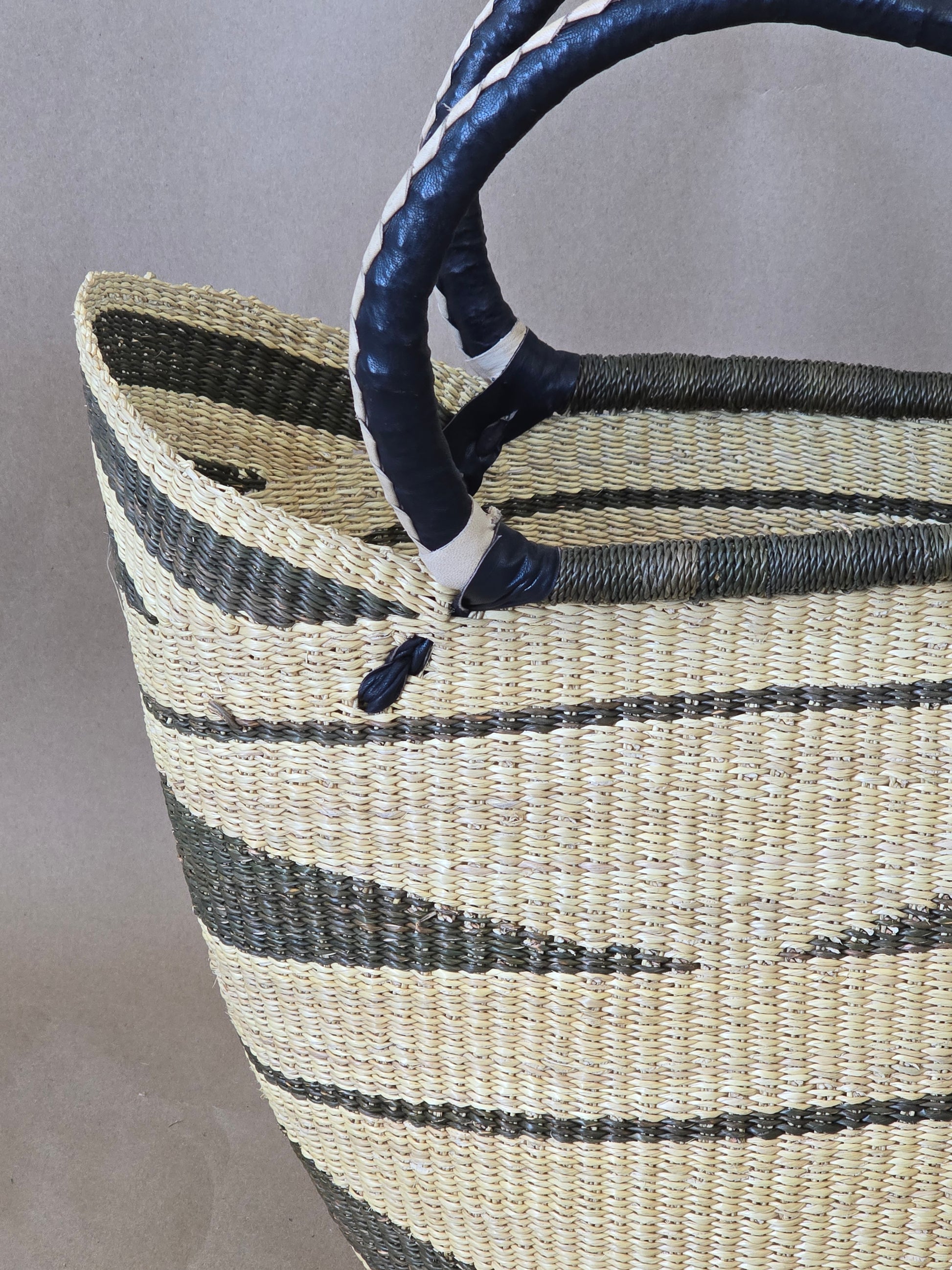 This comfortable basket is a perfect fit for shopping or going to the beach or on a picnic. The basket woven out of natural elephant grass is light, but thanks to its goatskin handles also durable, holding heavier items, too. With its elegant look, it can easily replace a purse on a summer concert or a beach trip. Should there be a moment when the basket does not have any other use, it is also perfect for storing magazines waiting to be read, or for hiding the hats and scarves that tend to pile up in the hallway. It is a truly multipurpose basket that has a place in every home.