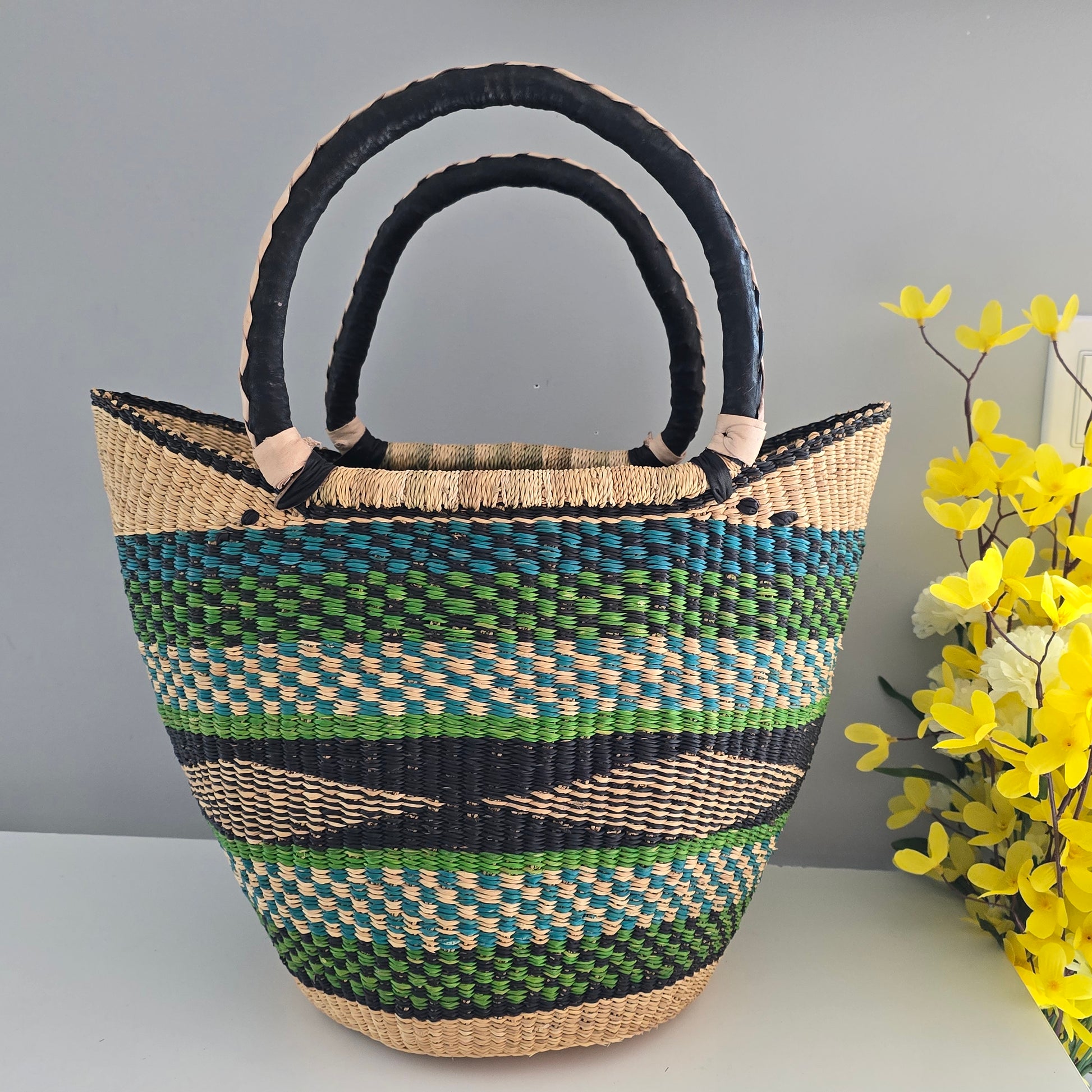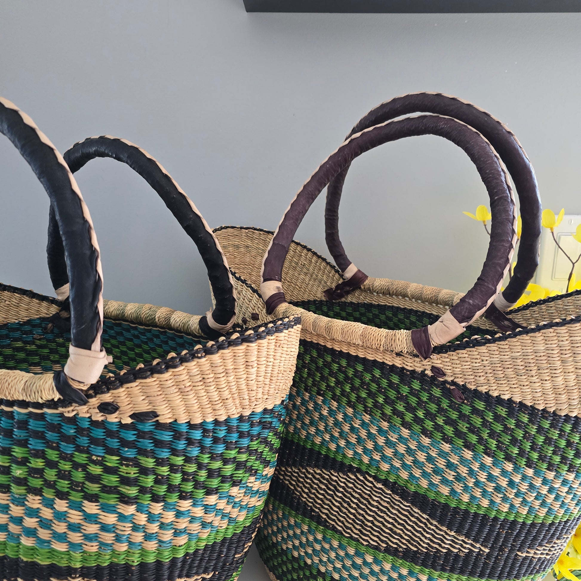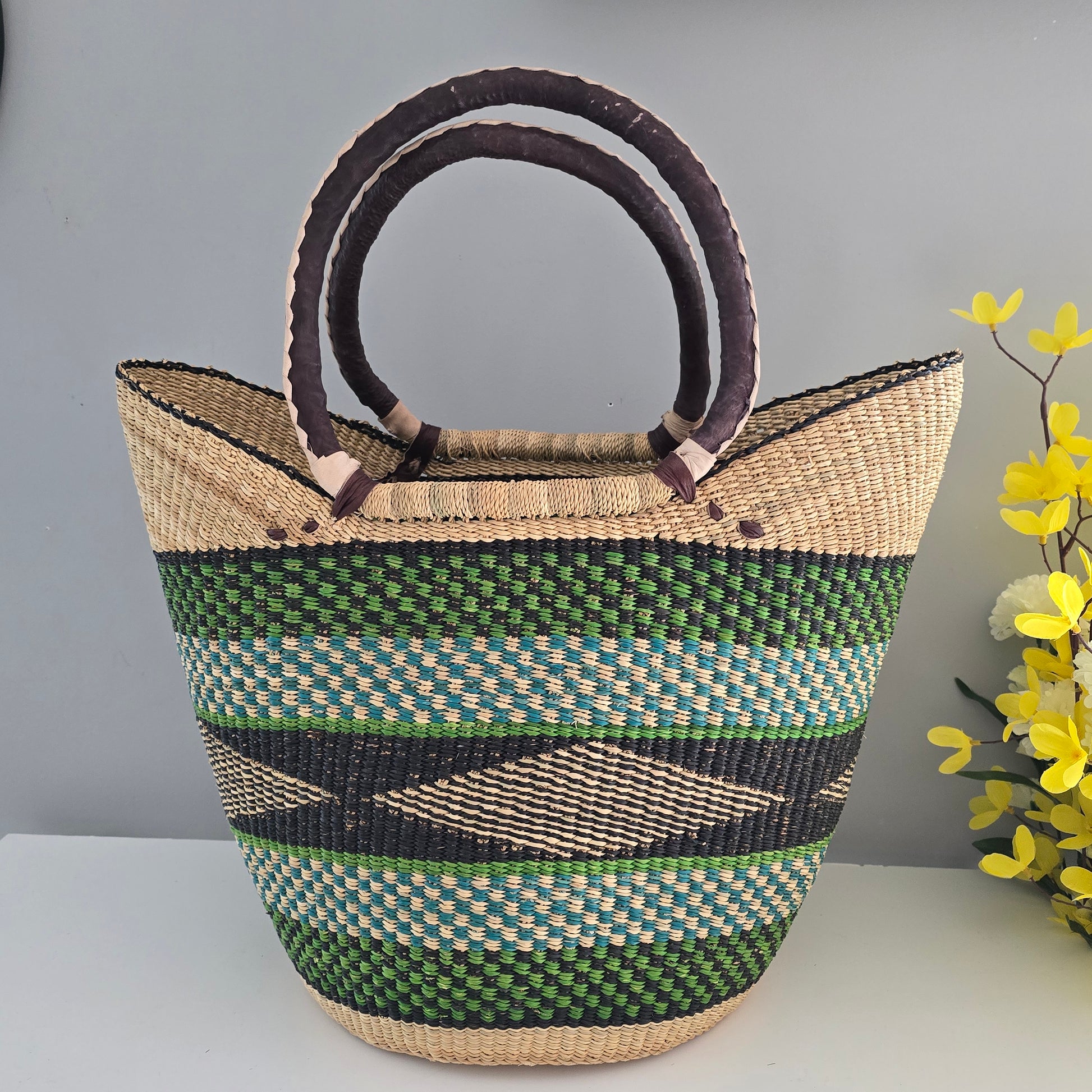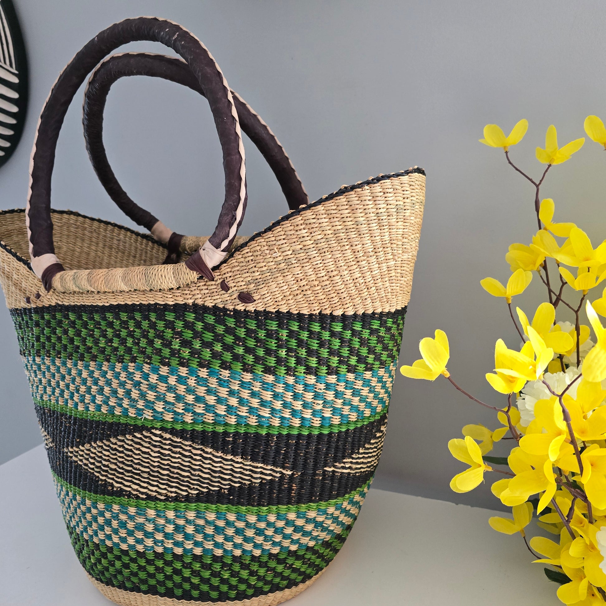 This comfortable basket is a perfect fit for shopping or going to the beach or on a picnic. The basket woven out of natural elephant grass is light, but thanks to its goatskin handles also durable, holding heavier items, too. With its elegant look, it can easily replace a purse on a summer concert or a beach trip. Should there be a moment when the basket does not have any other use, it is also perfect for storing magazines waiting to be read, or for hiding the hats and scarves that tend to pile up in the hallway. It is a truly multipurpose basket that has a place in every home.
