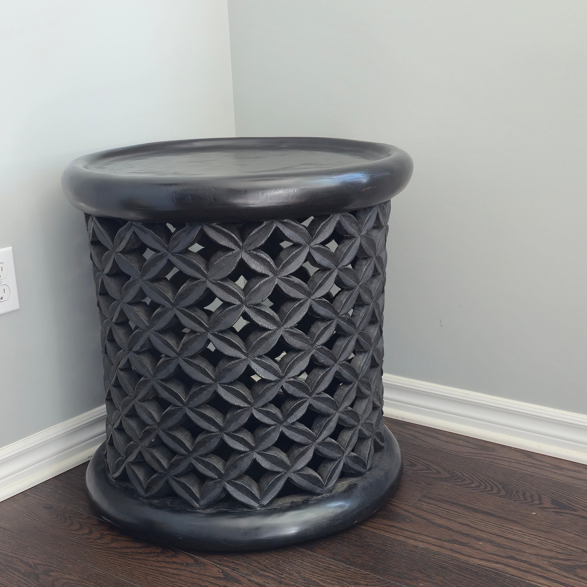 Look at this creation! Isn’t this gorgeous? It is a Bamileke stool. These hand-crafted stools are carving into a continuous piece of tree. The process is astounding. First, the craftsman thrown the trunk into the river to be softened up for carving. During the carving process, if there is a break in the wood the entire piece is abandoned as it is viewed as a break in the continuity of life. Then, he dryed the stool and do all the finishing touches. These are done entirely by hand from massive woods and come in a variety of patterns and sizes. This one pictured is based on a centuries old design. Known as Bamileke stools, they were traditionally used only for special ceremonial seating by the Bamileke Tribe of Cameroon.