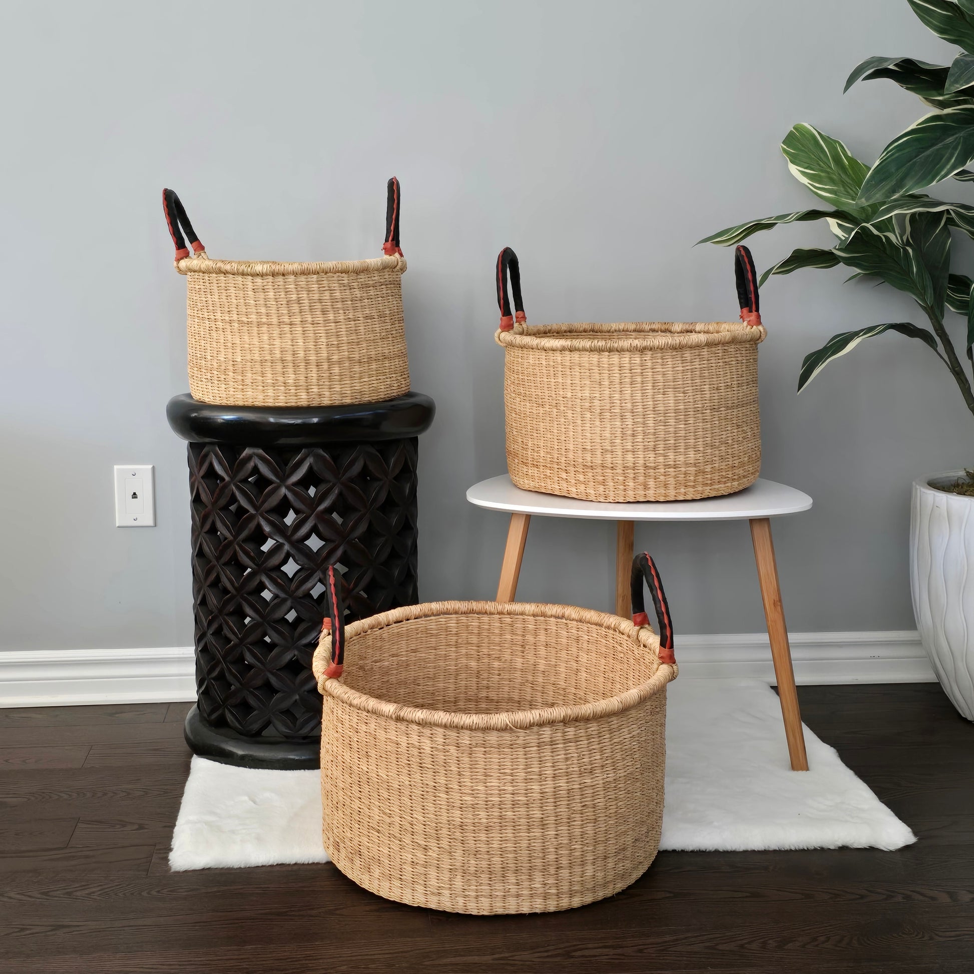 Introducing our Woven Floor Basket, a beautiful fusion of tradition and functionality. Crafted by artisans in Bolgatanga, Ghana, from sustainable elephant grass, this basket offers both aesthetic appeal and practical storage solutions. It is ideal for storing throw pillows, blankets, magazines, clothes, or shoes and as a decorative element to enhance your home décor. Bring home a piece of Ghanaian artistry with our versatile and eco-friendly woven floor basket.