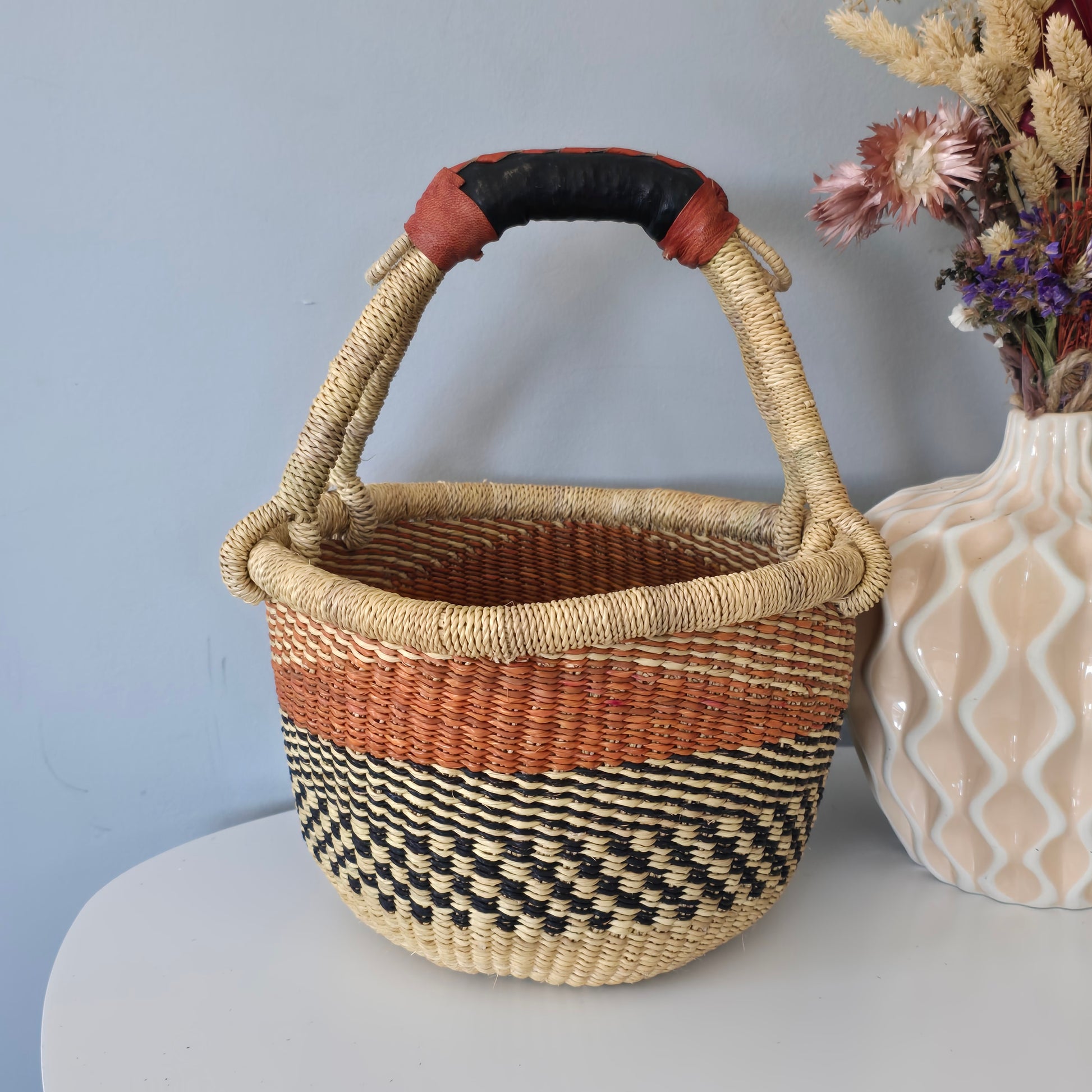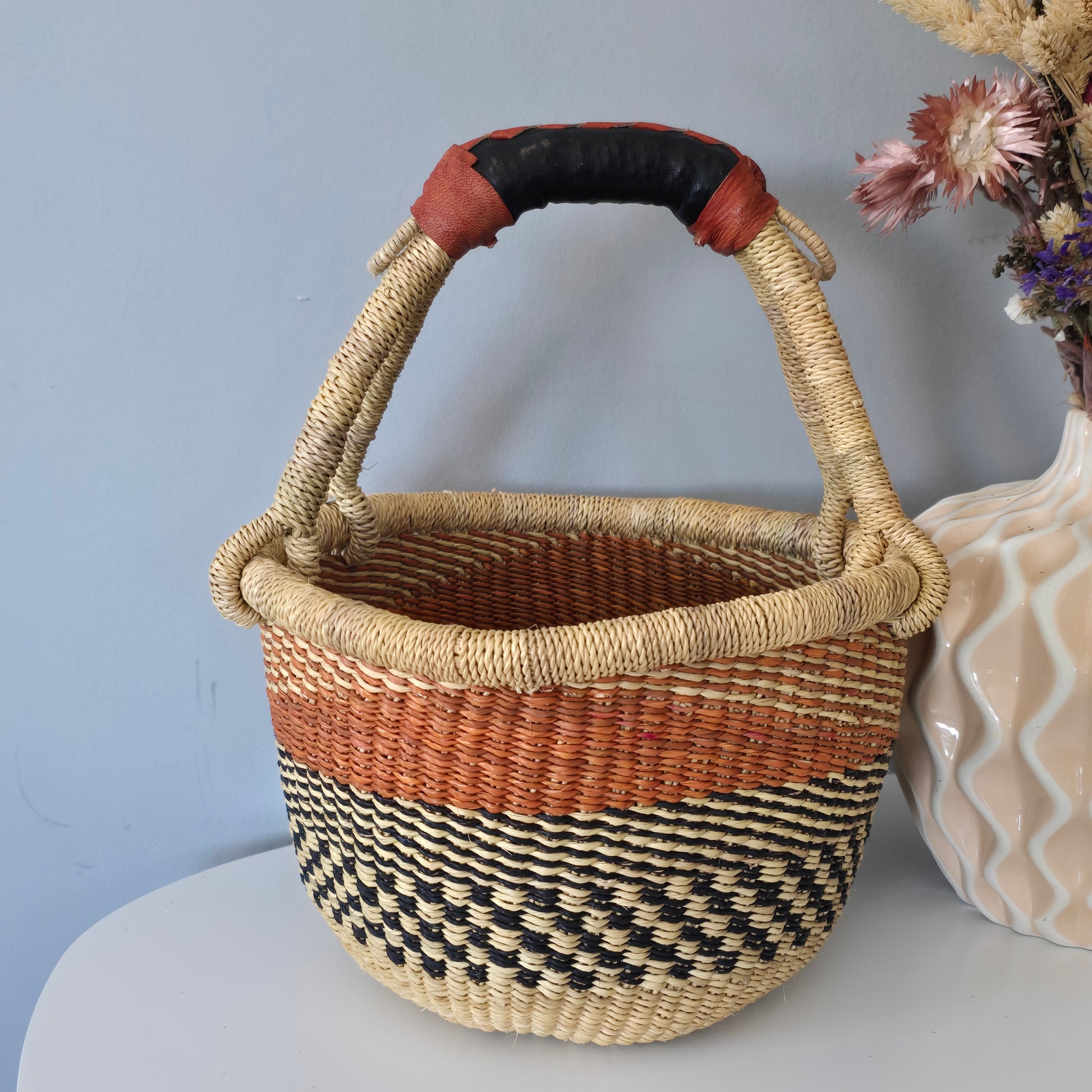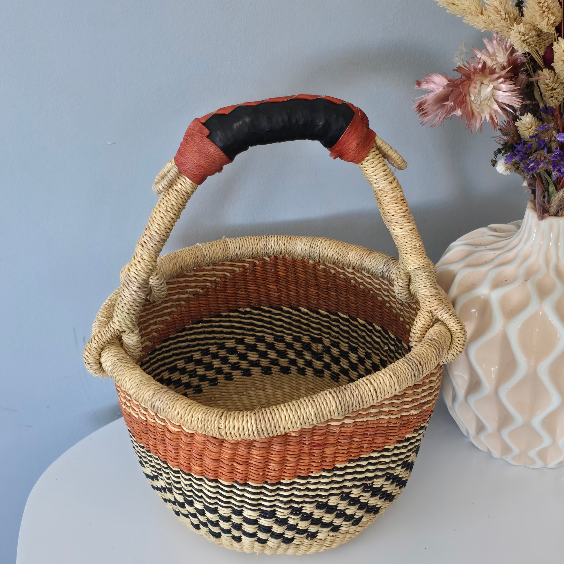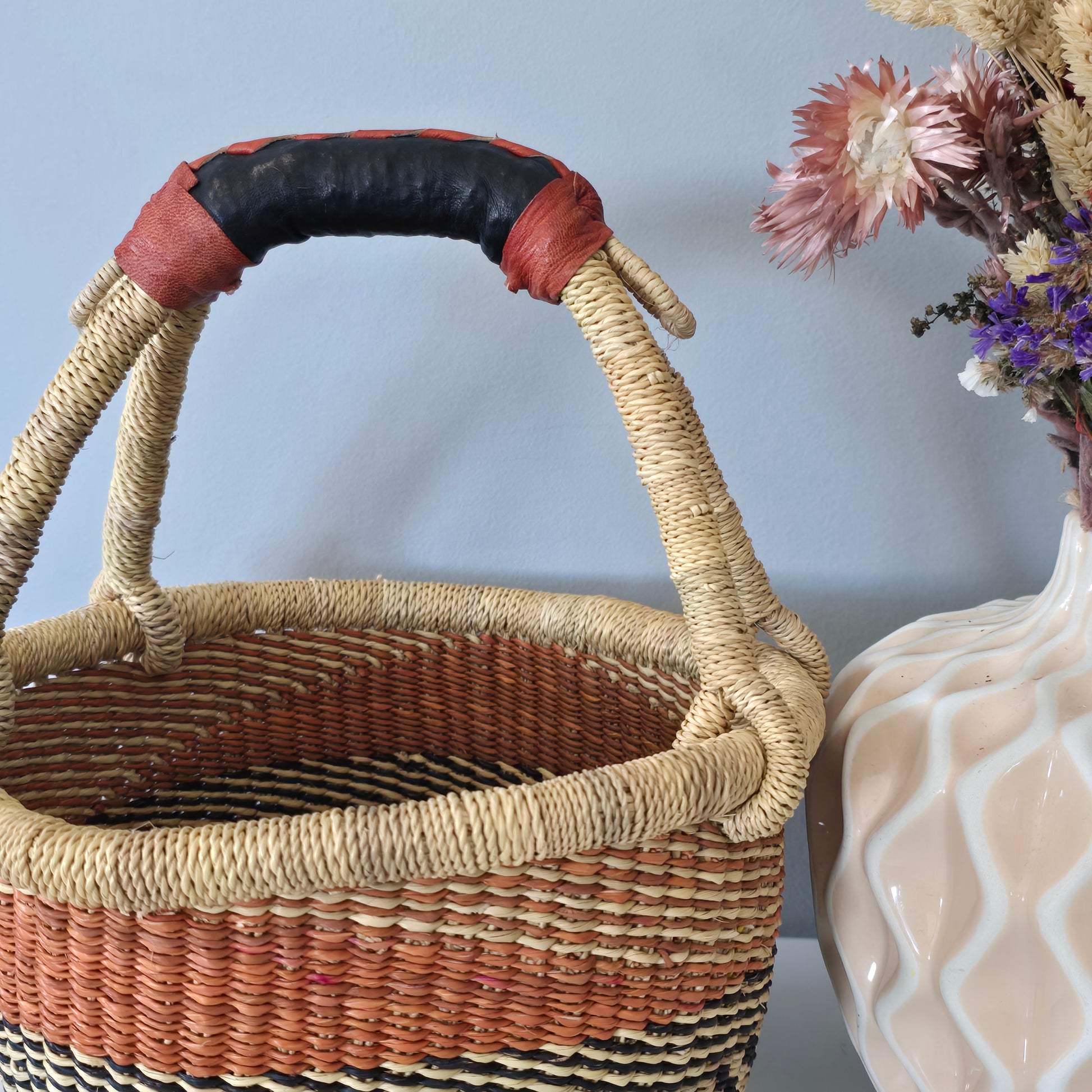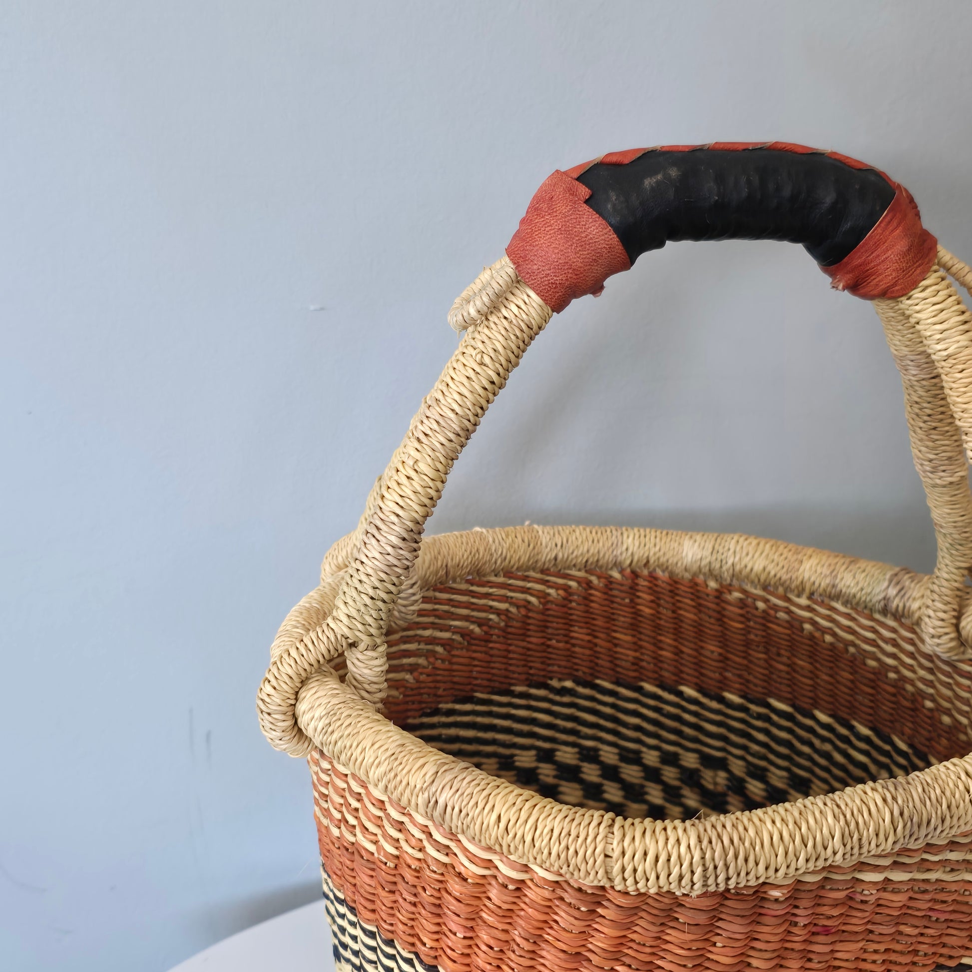 These Bolga baskets are ethically sourced and hand woven by the Frafra people using elephant grass in Northern Ghana. The handles are used with leather off cuts.