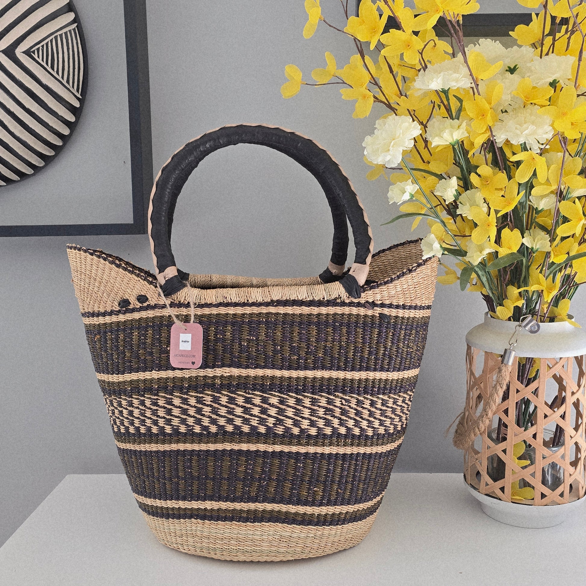 This comfortable basket is a perfect fit for shopping or going to the beach or on a picnic. The basket woven out of natural elephant grass is light, but thanks to its goatskin handles also durable, holding heavier items, too. With its elegant look, it can easily replace a purse on a summer concert or a beach trip. Should there be a moment when the basket does not have any other use, it is also perfect for storing magazines waiting to be read, or for hiding the hats and scarves that tend to pile up in the hallway. It is a truly multipurpose basket that has a place in every home.